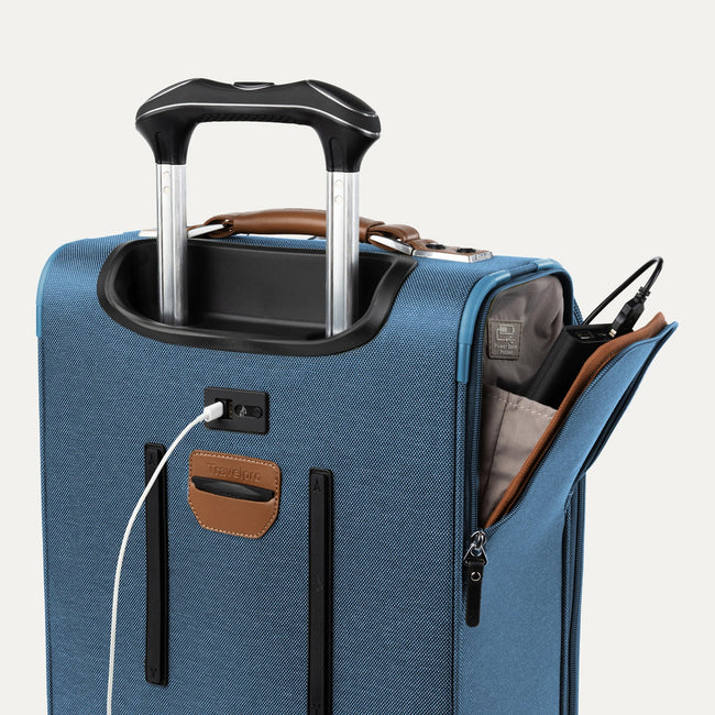 The carry-on spinner lets you power electronics on the go with an integrated USB port and dedicated back-up battery pocket that adheres to FAA regulations, while the drop-in, fold-out suiter keeps hanging clothes looking sharp and protected from wrinkles.