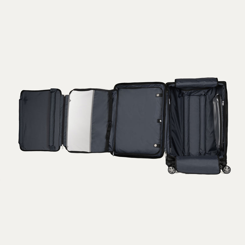 • Check in: Built-in, fold-out suiter keeps clothes wrinkle-free during travel