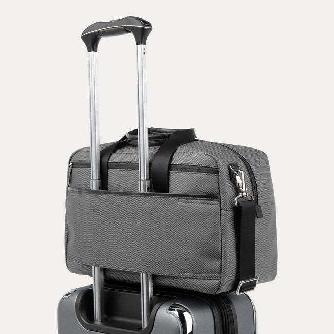 - Integrated rear strap slips around the extension handle of a Rollaboard® or spinner suitcase for secure stacking and hands-free mobility